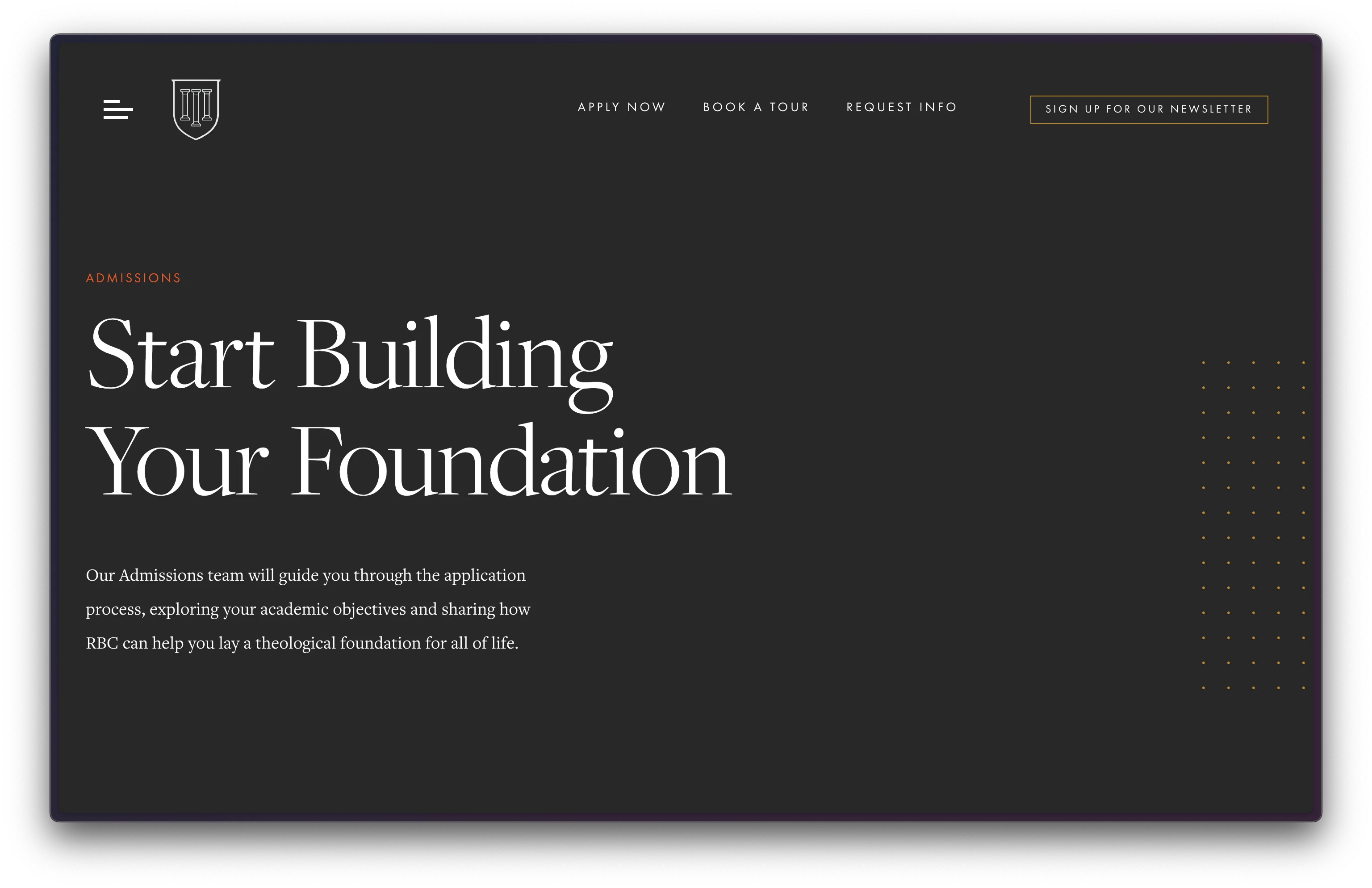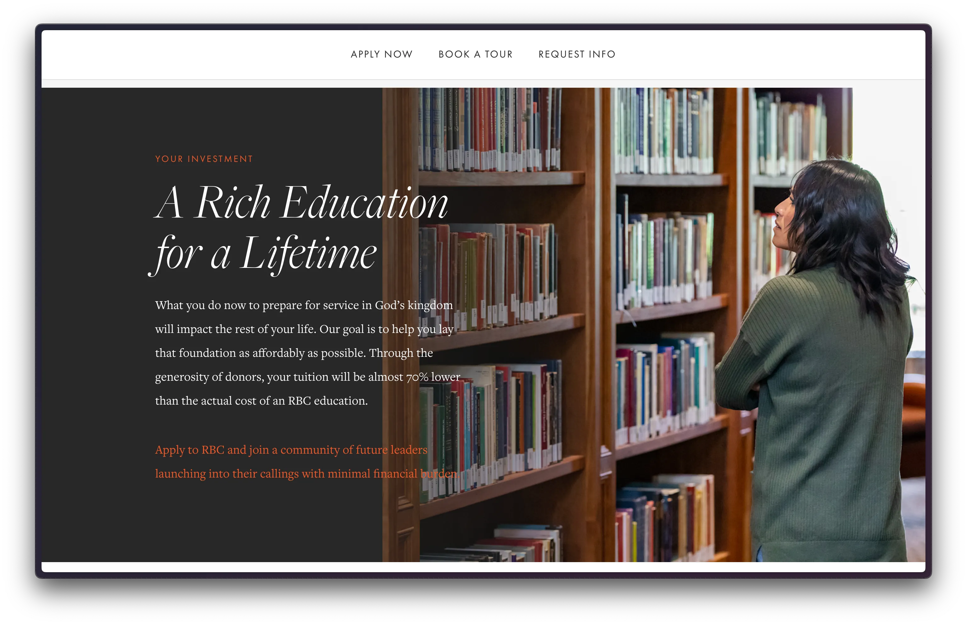 As a confessional, Reformed Evangelical college, with the whole purpose of training students to know that theology is for life, RBC needed an aesthetic that would help them stand out as a beacon of light across the higher education landscape.